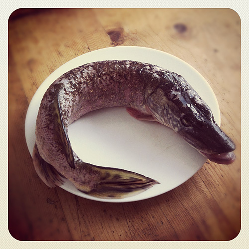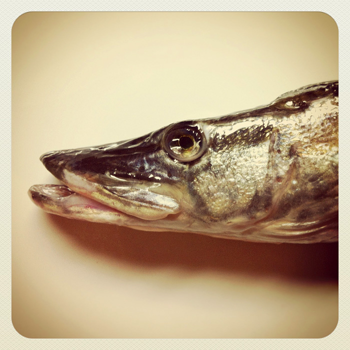 Dnes mě na trzích přepadl náhlý nákupní impulz — krásná štika z Pstruhařství Mlýny. Měla asi třičtvrtě kila, byla vykuchaná a bez šupin. Co teď ale s ní, že jo? Páč se štikama to vůbec neumím.