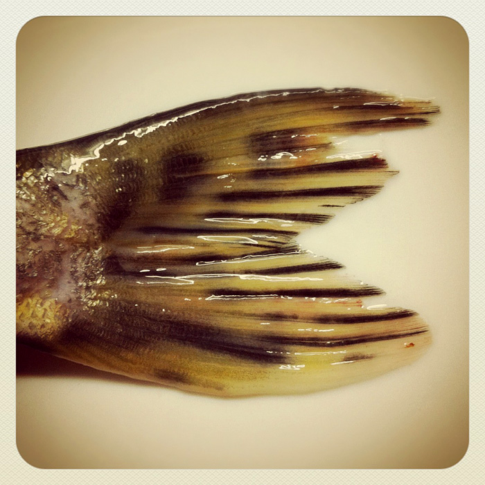 „Je vidět, že ryby zrovna moc nejíte. Tohle tomu přece teprve dá správný šmak. Když mám, hodím do vody ještě pár mušlí a čerstvých řas.“