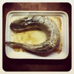 Nejdřív jsem ji teda pořádně umyl, vystřihnul jsem jí žábry a napnul jsem ji pěkně do oblouku pomocí špagátku. Hodně a poctivě jsem ji pokapal citrónem, posolil a nechal mezi okny asi půl hodiny. Vodu slít, pak trouba na 160 stupňů a šup ji tam. Máslo šlo jen navrch v několika plátcích. Jinak nic. Za čtyřicet minut měla vnitřní teplotu lehce nad šedesát — hotovo. Nechat odpočinout, nahřát talíře a odloupnout z každé strany jeden macatý bílý filet. Pak už jen troška výpeku, malinko citronu a mňam!