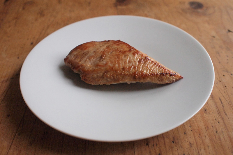 Tady už se dostáváme k typickému zoufalému případu, který jsem vám věrně zrekonstruoval na kousku krůtího prsa. Když ho nešetrně uděláte na pánvi a vcelku jej hodíte na talíř, máte 100% pravděpodobnost, že nebude stát za nic. Bude tuhý a suchý.