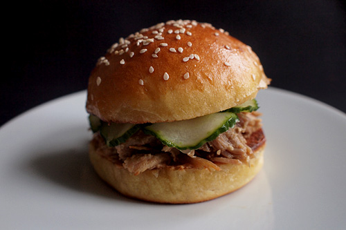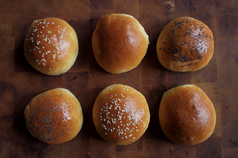 Vypadají jako z reklamy na hamburgery a co je nejlepší — jsou takové i v reálu. V první verzi jsem použil hodně máslové briošky podle Thomase Kellera, ale v kombinaci s vepřovým z toho byl sendvič hodně těžký (strávníci se pak váleli po zahradě v bezvědomí). Pomohl osvědčený Peter Reinhart, který brioškové spektrum krásně dělí na tři pásma — briošku pro bohaté (úchvatných 88 % másla k podílu mouky), briošku pro střední třídu (50 %) a briošku pro chudé (20 %).