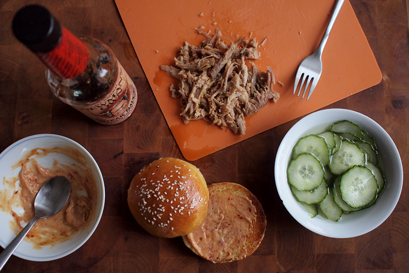 Hodně záleží, kolik porcí děláte, protože maso je třeba těsně před vložením do sendviče osvěžit trochou horké šťávy (cca lžíce na porci) a k ní ještě přidat pár kapek omáčky. Můžete to dělat u každého sendviče zvlášť nebo maso najednou ochutit stranou. Na maso pak už jen přijde několik plátků okurky a úplně nahoru brioška.