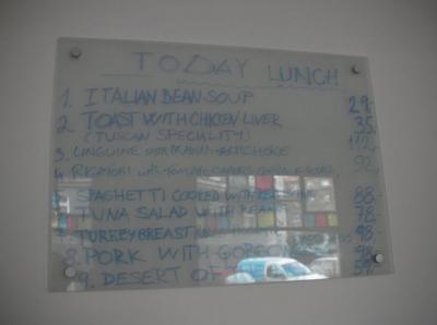 V Osterii jsme byli v poledne jedinými hosty, později se začala docela dobře zaplňovat. Vzhledem k tomu, že nefungovala tiskárna, bylo polední menu napsáno ručně na jedné stránce. K nahlédnutí nám bylo nabídnuto i menu večerní, z čehož některé položky byly flexibilně k dispozici i v poledne. Z vinného lístku jsem zvolila dvě deci rozlévaného Merlot, který nebyl vůbec špatný. Pro anglicky mluvící návštěvníky bylo pak menu napsáno na tabuli.
