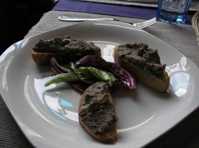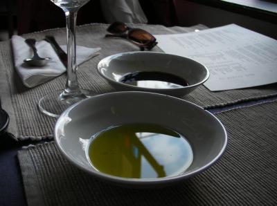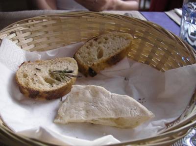 Na úvod nám byl přinesen košíček se dvěma druhy křupavého a rozmarýnem vonícího chleba. Na namáčení chleba pak jedna miska s olivovým olejem a druhá s balsamicem.