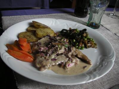 Od Cutie jsem ochutnal její krůtu, opravu skvěle zvládnutá tomatová omáčka, s kousky česneku a bazalky, jedna z nej omáček co jsem měl na mase letos. K mrkvi nemám výhrady, výborná jednoduchá. Moje vepřová panenka měla na sobě maličko kousky smaženého salátu a česneku v jemně pepřové omáčce z gorgonzoly, za zmínku stojí i povedená barevná kombinace na talíři s hráškem. Brambory mám ale ze zahrádky chuťově lepší. (abych se taky pochválil..už zase..)