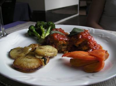 Posléze následovala krůtí prsa v rolce s tomatovou omáčkou a zeleninou, kombinace dokonalá jak vzhledově, tak i chuťově. Křehké maso, výborná zelenina (to by jeden nevěřil, jak dobře může chutnat „obyčejná“ mrkev. Od Kuby jsem ochutnala neméně dobrou vepřovou panenku s gorgonzolou.
