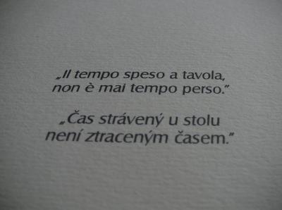 Úvodem – byl jsem tam já první host..Jasně, že jsem cvaknul to anglické menu, bylo více na světle. Ale bylo mi už u usednutí vysvětleno proč to tak je a že mi klidně nabídku přečte, v pořádku. Jelikož jsem nekonzument vína, vínem takřka odkojená Cutie si vybrala sama a dobře jí tak :-) Právě protože jsem přišel o minutku dříve, prohodil jsem s obsluhou pár slov, multikonverzace slovenština čeština – doporučeno dnešní tiramisu, že je prý moc dobré! A též jatýrka, ty jsem odmítl, trpěje antijátrovou fóbií ze školní jídelny.