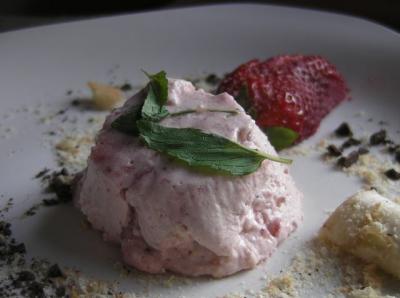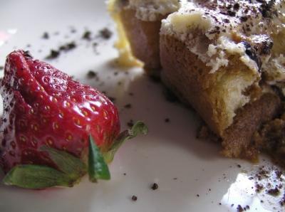 Po třetím chodu jsem si nebyla jista, zda zvládnu ještě dezert (gauč u vchodu byl lákavým místem na krátký odpočinek a vytrávení), ale poté, co jsem zpozorovala k vedlejšímu stolu nesené tiramisu, šla jsem do toho. Zvolila jsem „lehčí“ variantu – jahodovo-banánovou pěnu s piškoty, která se příjemně rozplývala na jazyku. Kubovo tiramisu bylo rovněž moc dobré.