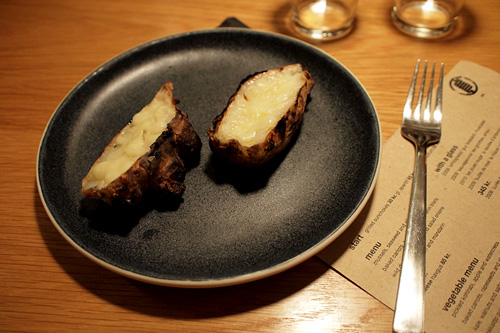 No, obyčejný topinambur. Byl pěkně macatý, pomalu grilovaný ve slupce skoro až do černa. Potom napůl a nahoře s lehce rozteklou vrstvou připomínající žloutkový krém s citrónovou kůrou (tady jsem si nebyl jistý, což se mi v Kodani stávalo častěji, než bych chtěl).