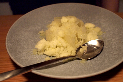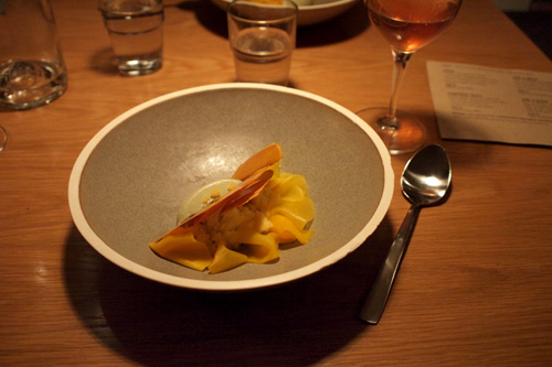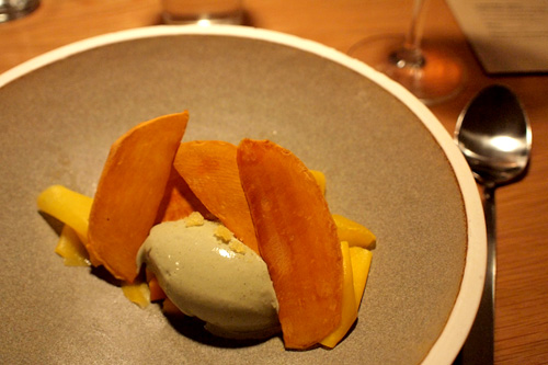 U dezertu jsem měl příjemný pocit, že zažívám exkurzi po vyšší sezónní dívčí. Doznívající podzimní dýně a k tomu plynule navazující náznak prosincových mandarinek. Všechno smysluplně rozložené do tří funkčních složek — krémová zmrzlina (s dýňovým olejem), mandarinkový sorbet a hokkaidó na plátky (křupavé vs. na kyselo nakládané). Velké neprofesionální vyškrábání misky.