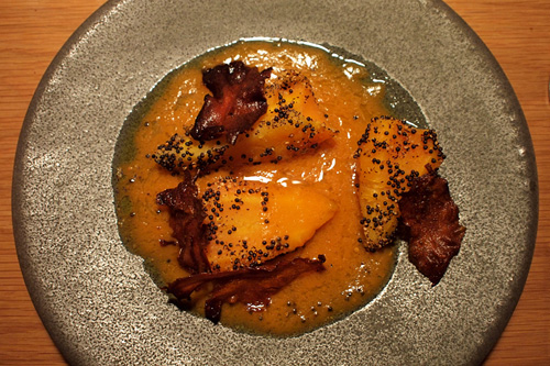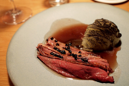 Dostali jsme vůbec k jídlu nějaké červené maso? Prakticky ne. Oldschool masoužrout by mohl uprdávat snad jen u chodu s divokou kačenou. Udělali ji podle té nejkrvavější fantazie a snad poprvé v živote jsem tu měl k masu místo pepře vykřupané bobulky černého bezu. Popelem pokropený obláček v pozadí je vařená cibule (jediná zkušenost, která mi nesedla).