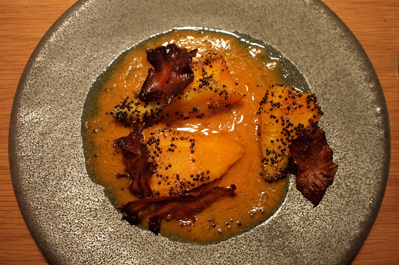 Napočítali jste jako já pouze tři hlavní složky? Počítáte správně. Více než tři hlavní linie v jídlech z Relae nenajdete. Když mrkev, tak třikrát a s postupným zesilováním chutě. Vařená s praženým řepkovým semínkem, v omáčce s bílým vínem a nakonec kruťácky vypečená do chipsu skoro jako slanina.