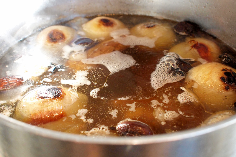 do tohoto kotle se vkládá -(celá cibule i se slupkou celá skořice, pár kardamonů, zázvor neoloupaný, česnek, taktéž), to vše se nasucho opraží na pánvi až je to skoro černé a vloží do vývaru. vaří se několik hodin. do polévky se musí přidat také chilli paprička, trochu rybí omáčky a glutaman sodný. ten je bohužel nepostradatený.. na poslední hodinu se do vývaru vloží celá kachna, nebo slepice. vývar se musí vychladit a sebrat veškerý tuk. potom se zcedí a je hotový.