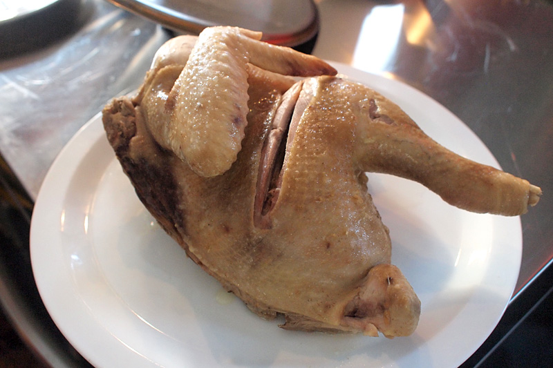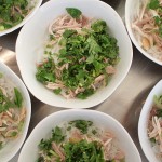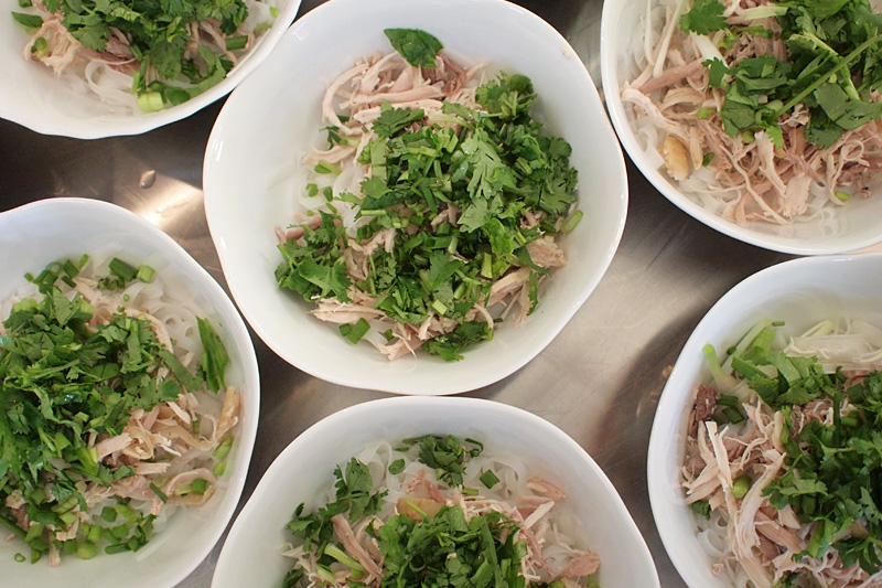 bílé nudle se na hodinu namočí do studené vody s citronem, potom se uvaří a vloží do misky. kachní, nebo slepičí maso z vývaru se nakrájí i s kůží na tenké plátky a položí na nudle. na to na jemno nakrájená jarní cibulka, zelená i bílá část, koriandr a čínská bazalka.