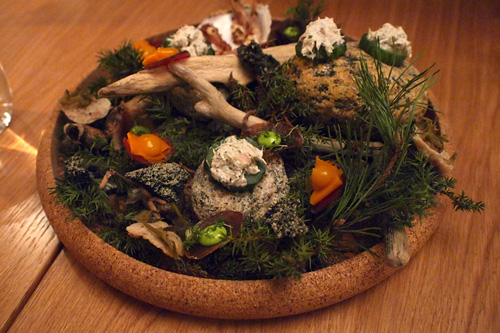 ty první chody jsou přeci amuse bouche — šest malých soust pro každého hosta ještě předtím než přijde překrm. u nich je přeci typické, že na stůl přicházejí vždy s trochu přehnaným servisem — na velké lžíci, na kamenné misce nebo destičce, na kusu extravagantního porcelánu. je to konvence, akorát tady je nedávají po jednom a mezi chody, ale soustředili je do jednoho bodu + použili pro servis výrazové prostředky jim blízké. tj, proto ti servírují jídlo na větvičce, kameni z pobřeží Bornholmu nebo na mechu ;)