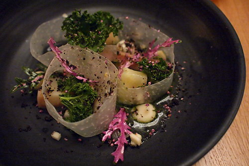 Ve stejném duchu i lehounce upravená makrela s výběrem zimní zeleniny, které se tu dostalo té nejuctivější úpravy. Dole bujón z mušlí a koprovým olejem. Ve střední vrstvě vařený celer a jablko. Trocha majonézy na okraji a nahoře supertenká kedlubna a blanšírovaná kapusta.