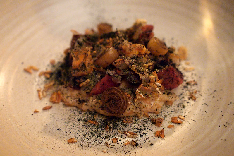 Špaldová kaše s kohoutím srdcem a telecím jazykem je v Kadeau výraz klasiky. Ochutnal jsem jen kousek, ale byla to radost. Celé jídlo bylo navíc provoněné opečenou šalotkou, opraženým obilím a popelem (který je na severu poměrně častý). Museli byste být na svou maminku hodní minimálně celý rok, aby vám tak dobrou kašičku s kousky krvavého masa připravila…