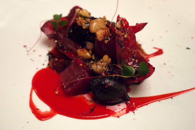 A co náš hlavní chod — autonehoda na talíři? Ani náhodou! V husím sádle konfitované hovězí (nejde ani vidět) a červená řepa na tři způsoby! Vše provoněné a promazané uzeným morkem a popelem ze sena. O kyselost na vyrovnání se postaral šípkový ocet.