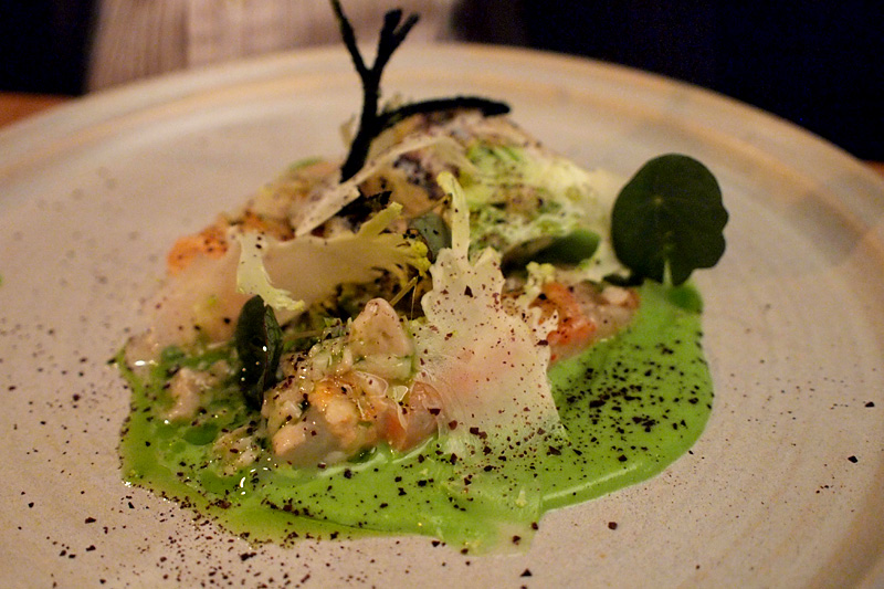 Syrový humr a ústřice se salátovou emulzí je naproti tomu příklad severské chladné krásy. Vůně moře, svěžest, kyselost a trpkost z bylinek. Květák na křupnutí. Pár kapek oleje z trávy na probuzení fantazie.