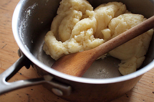 Začněte tím, že ve větším kastrolu přivedete k varu mléko a vodu s cukrem, solí, a máslem. Ihned poté odstavte a přisypte všechnu mouku. Míchejte vařečkou, dokud se vám neudělá velká koule. Vraťte kastrol na střední plamen a šmrdlejte v něm těsto dokola alespoň další dvě minuty. Malá část těsta se přichytí na dno, ale to vůbec nevadí.