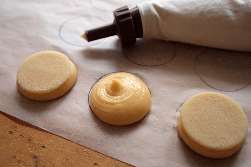 Teď si sestavte obě komponenty dohromady. Vezměte si pečící papír a nakreslete si do něj kolečka přesně podle rozměrů vašeho vykrajovátka. Dolů přijde odpalované těsto a nahoru mražený deklík z těsta druhého. Tady se pracuje s cukrářským pytlíkem s normálním otvorem ve špičce.