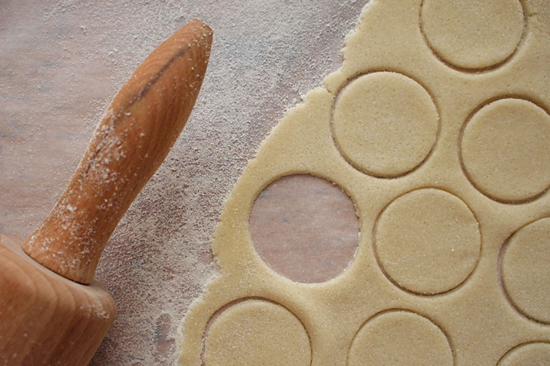 V druhém kroku je třeba ho rozválcovat válečkem do tloušťky 2 mm. Já na to šel s vydatným podsypáním podložky polohrubou moukou a trpělivým valením celkem ve čtyřech dávkách. Protože nemám vykrajovátka (ach!), vykrajoval jsem skleničkou na destiláty s průměrem 3,5 cm, což bylo pro pěkné boubelaté výsledky ideální číslo. Zkoušel jsem i o něco větší vykrajovadlo s 4 cm a šlo to bez problémů také.
