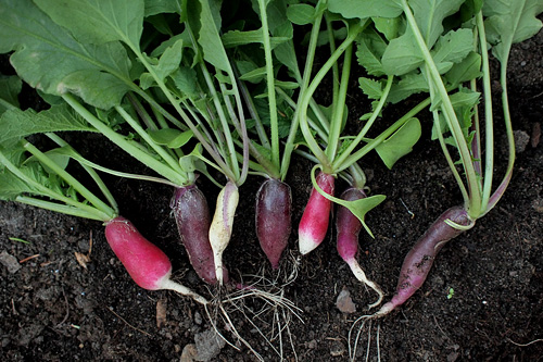 My letos semínkovali – pěkně z gruntu jsme to vzali. Ředkvičky lezly ze země jako bláznivé, pak ovšem z ničeho nic změnily strategii a jaly se vyrábět listy. Takové ředkvičkové šlahouny nám bleskaly ze záhonu. To bude ale úroda! – mnuli si ruce nezkušení zahradníci… :-)