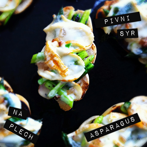 Toast na fotce splňuje vše. Dole je „včerejší“ rozmarýnová houska oživená na plotýnce. Uprostřed na grilu spařený a ochucený zelený chřest. Navrchu pivní sýr a několik kostiček z vysokého špeku. Zapečeno v troubě shora asi na pět minut.