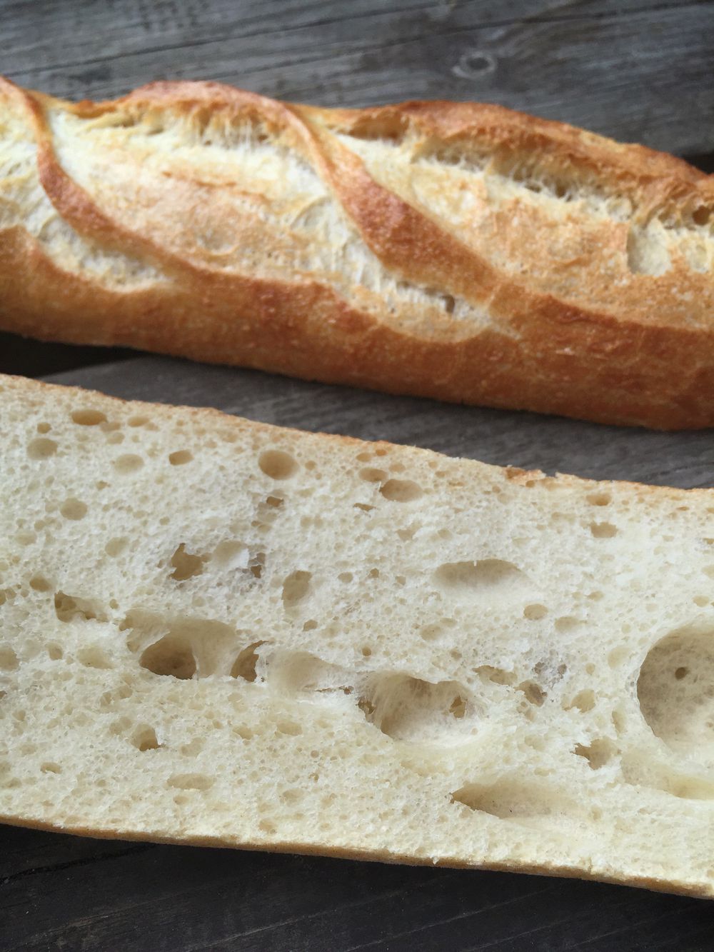 Se samotným pečivem mám ale problém. Čekal jsem krásnou otevřenou střídku plnou lesklých bublin. Bagety z Le Caveau jsou ale po nakrojení někde úplně jinde. Střídka je uzavřená, hutná a slušná bublina se mihne jen občas. Kůrka je také jen slabě křupavá a ne moc dobře vyvinutá.