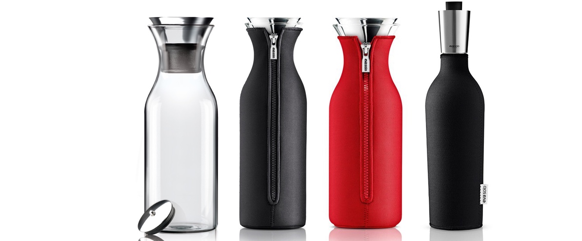 Skleněné karafy s neoprenovým kabátkem jsou typické pro designovou značku Eva Solo. Skvělá věc pro domácí limonády nebo zastudena louhované čaje (i kávu). V zimě zase třeba na krásný servis svařeného vína, které takhle vydrží dlouho teplé.