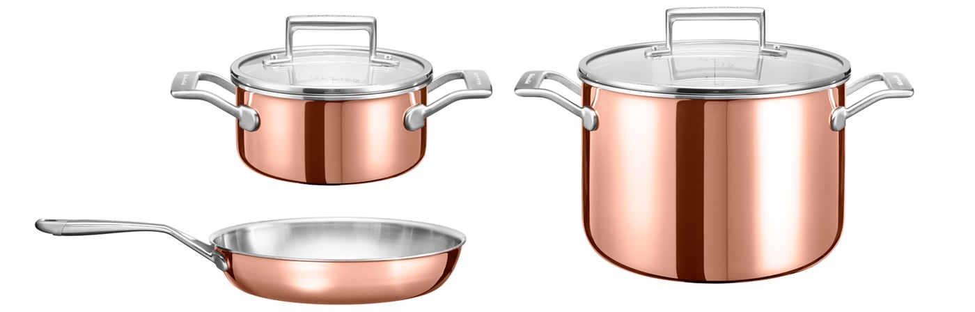Luxusní dárek na celý život. Kulina nabízí měděné nádobí od čtyř kvalitních značek. Pokud hledáte klasiku, určitě vybírejte u značky Mauviel nebo de Buyer. Modernější pojetí pak najdete u značky KitchenAid a Eva Solo.