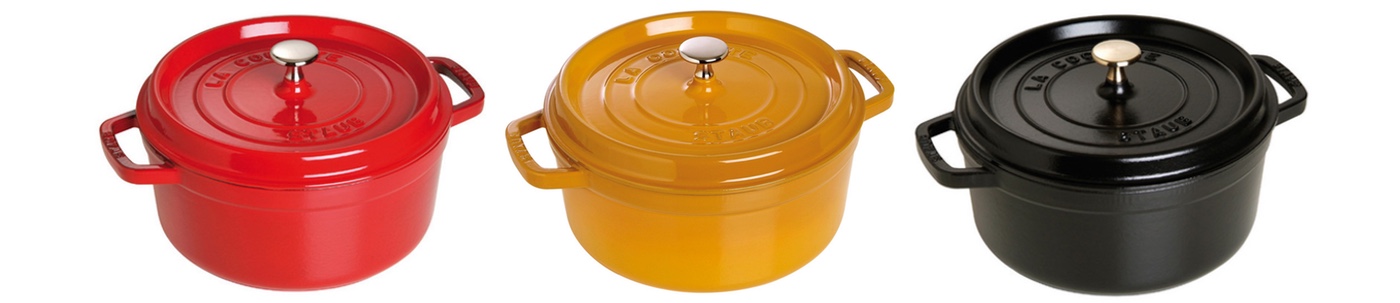 Klasika v nádobí, které by chtěl mít doma asi úplně každý. Opět platí - tady asi nelze při výběru udělat chybu. Záleží jen na cenovém rozpětí a zamýšleném použití. Staub dělá nádobí z odlévaného smaltového železa, které je pěkně masivní a zároveň nádherně vybarvené.