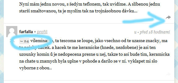 Šipku pro odpověď, najdete u každého příspěvku ve fóru – stačí na ni kliknout a v políčku pro váš příspěvek se vám automaticky doplní vše potřebné. Po odeslání je pak na začátku odpovědi pěkná šipka s odkazem.